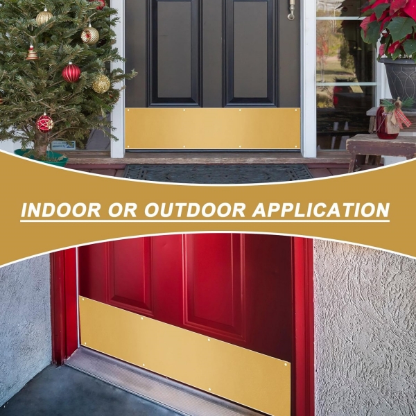 You will receive: this package contains 2 door kick plates, which are enough to meet your daily use needs easily; Prevent your pet from scratching the door panel with the right size when opening the door: the metal plate door protector is moderate in size, easy to prevent the bottom of the door from being worn, matched with other articles, and suitable for indoor and outdoor doors. Reliable quality: made of high-quality aluminum plate, the kick plate used for outdoor doors is not easy to deform or break, which can provide you with services for a long time, so that you can enjoy a pleasant experience with ease. Easy installation: the metal door panel is easy to install, only three steps are needed; Put the kick plate in place, tighten the screws not included in the package, and then remove the surface protection to complete the installation. It is widely used: this outdoor door panel is designed for many swinging doors to decorate and help avoid wear marks or other damage, and can also add some beautiful charm to your home, apartment and so on.