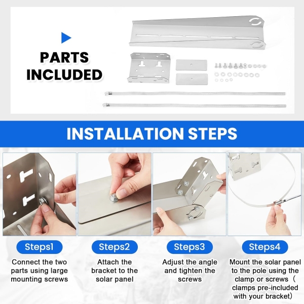 - Easy to Install: the solar brackets come with all necessary screws, bolts, washers, and steel clamps needed for an effortless installation; The only thing you need is a wrench knob to hold it in place